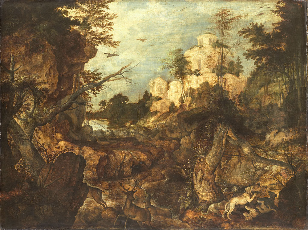 Everzwijnenjacht in een rotsachtig landschap. Rechts op de voorgrond wordt een wild zwijn aangevallen door honden, twee jagers met lansen staan erbij. Tussen de rotsen vluchten groepen herten weg. Op de achtergrond de ruïne van een burcht