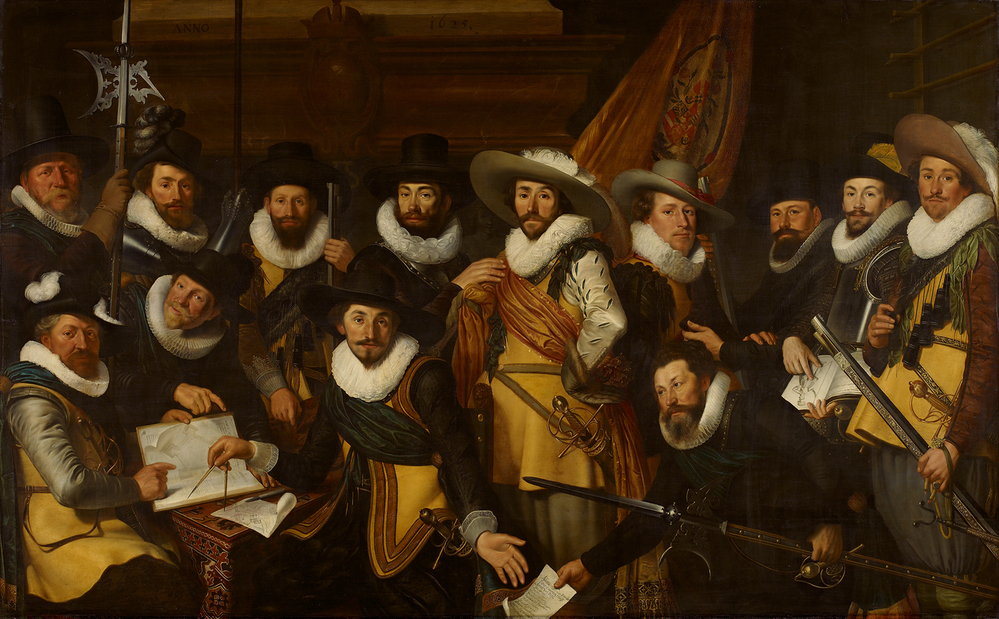 In 1625 schilderde Werner van den Valckert deze compagnie van schutters uit wijk VIII. Deze wijk lag ten oosten van de Nieuwmarkt, tussen de Geldersekade en de Oude Schans, ten noorden van de Keizerstraat en ten zuiden van de Kromme Waal. De man die in het midden staat is vaandrig Arent Willemsz van Buyl (?-1646). Aan tafel zitten kapitein Albert Coenraetsz Burgh (1593- 1647) en luitenant Pieter Evertsz Hulft 1578-1638). Burgh houdt een passer in de hand, waarmee hij, symbolisch, een kaart van de wijk met een plattegrond van een burcht verbindt. Zo benadrukt hij dat de veiligheid van de wijk door de compagnie is gegarandeerd. De tweede schutter van rechts houdt een militair instructieboek open, de Wapenhandelinghe van Jacques de Gheyn. Dit boek uit 1607, gemaakt voor prins Maurits, kan voor de schutters als een bron van praktische militaire kennis hebben gediend. het boek ligt opengeslagen bij de eerste plaat van het deel over ‘Spiesdraghers’. De prinsgezindheid van de compagnie wordt duidelijk door het vaandel waarop het wapen van Maurits te zien is. Zowel Burgh als Hulft hadden hun benoeming in de vroedschap te danken aan Maurits. De stadhouder overleed in 1625. het is niet ondenkbaar dat zijn dood de aanleiding vormde tot dit schuttersstuk. ( Tom van der Molen)