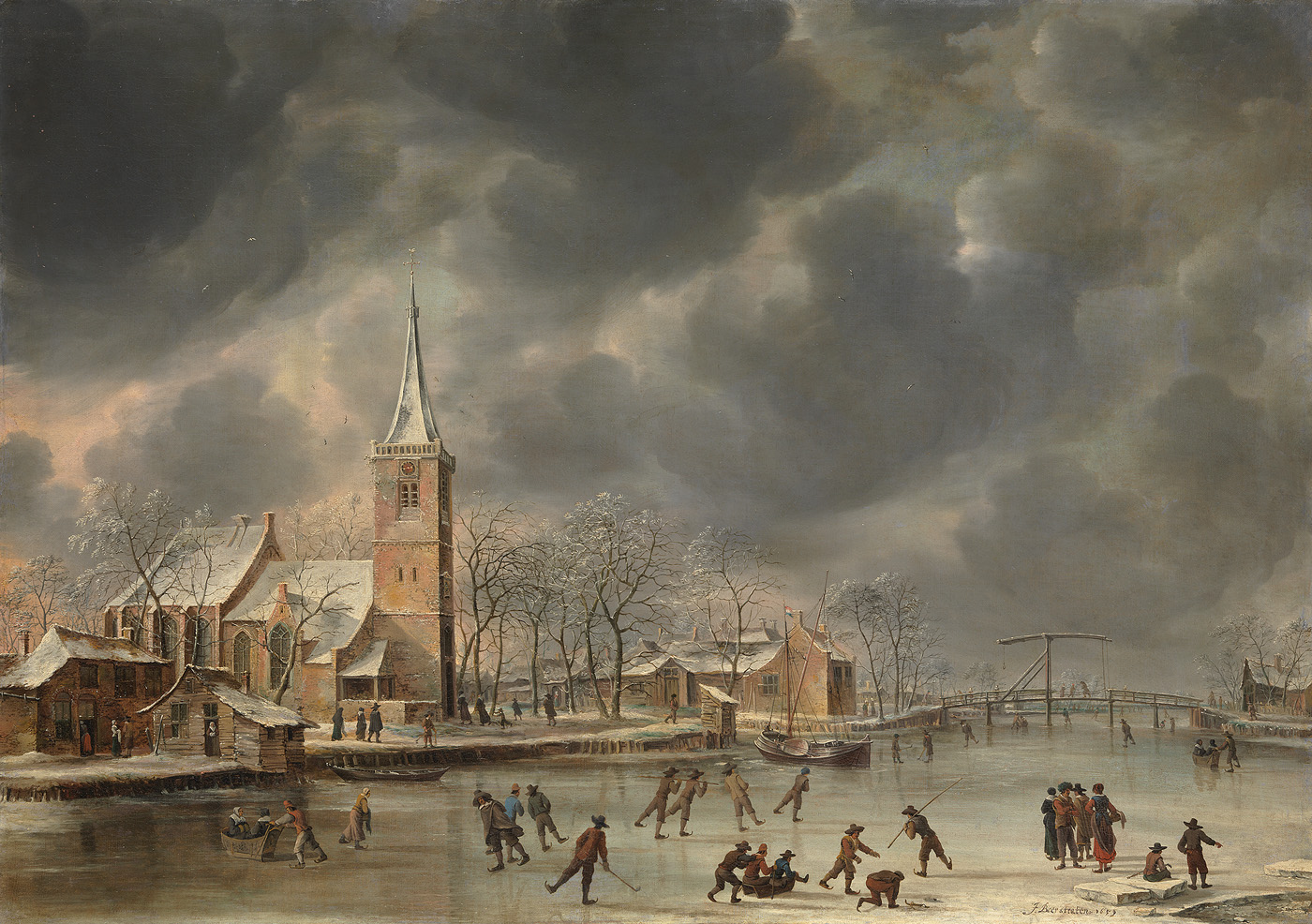 Adriaan van der Hoop kocht het schilderij door tussenkomst van de kunstmakelaars Jeronimo de Vries en Albertus Brondgeest in 1838 voor 218 gulden. Sinds 1934 wordt dit winterse tafereel door sommigen geassocieerd met Ouderkerk aan de Amstel. ( Norbert Middelkoop)
