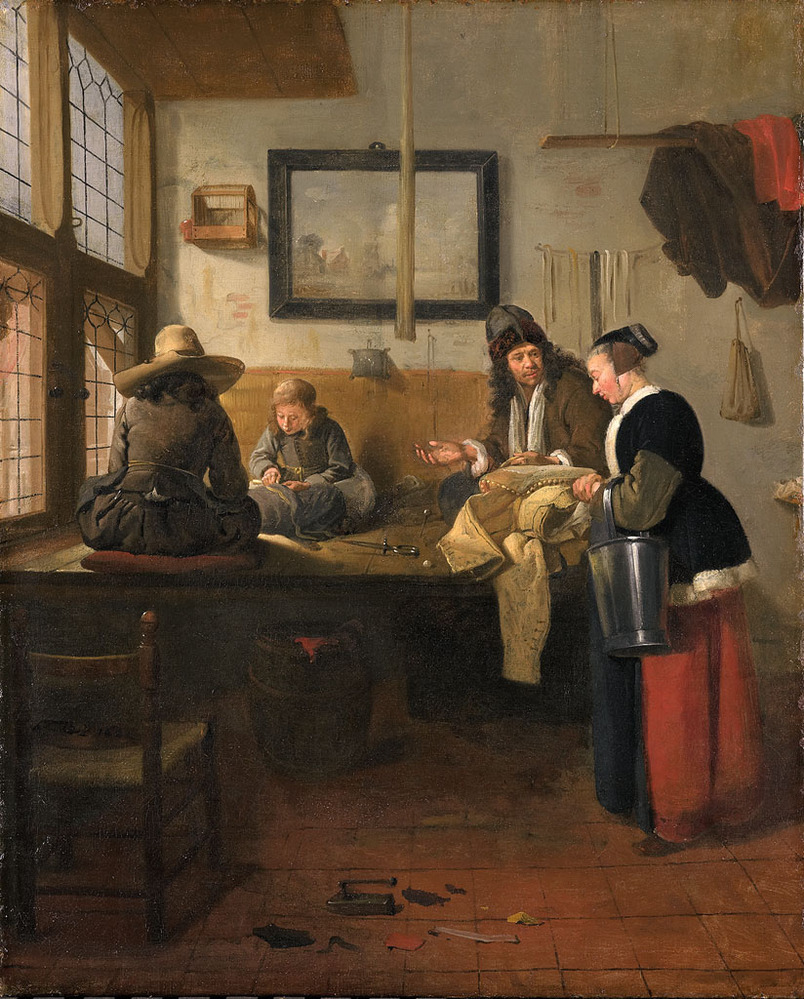 De kleermakerswerkplaats. Een kleermaker en zijn twee jonge knechten zitten op een tafel bij het raam te naaien. Op tafel ligt een schaar. Rechts een staande vrouw met een koperen emmer. Tegen de muur hangen een schilderij (rivierlandschap), een speldenkussen en een vogelkooitje