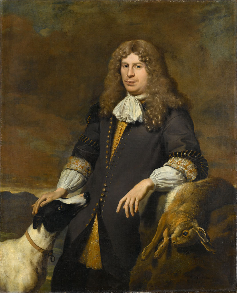 Portret van een man, mogelijk Jacob de Graeff, schepen van Amsterdam in 1672. Kniestuk, leunend tegen een rots, de rechterhand rust op de kop van een windhond, rechts een dode haas