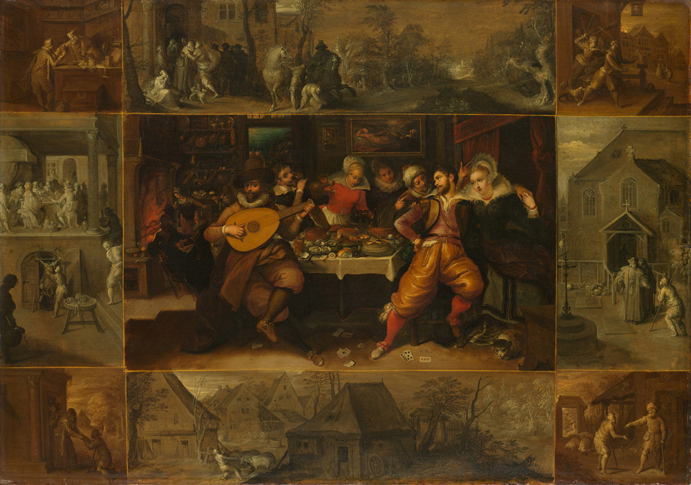De geschiedenis van de verloren zoon. De centrale voorstelling toont de Verloren Zoon die zijn erfenis spendeert in het bordeel met vrouwen, muziek, eten en drinken. Links aan de tafel een man met een luit. Rechts de Verloren Zoon met zijn arm om een vrouw aan de rand van een bed. Op tafel pasteien en oesters, op de grond liggen speelkaarten. Een vrouw schenkt wijn in roemers. Voor de haard worden vogels aan het spit geroosterd. Aan de muur een schilderij van Jupiter en Danaë. Hieromheen in acht scènes de andere episoden uit de parabel