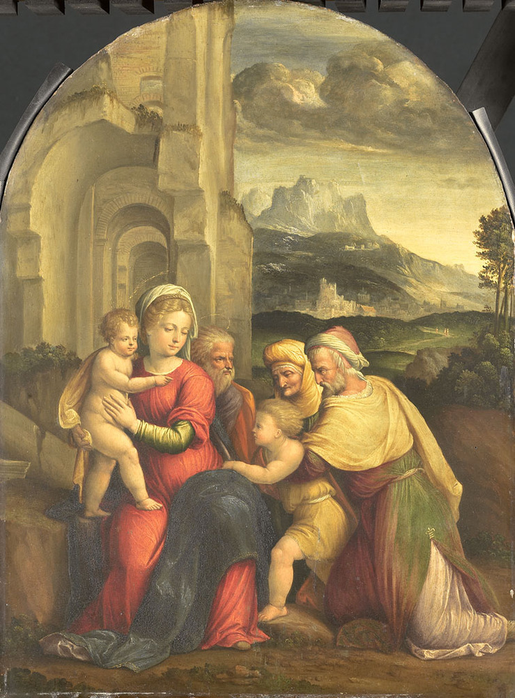 De Heilige Familie in een landschap voor een ruïne. Rechts Johannes de Doper als kind met zijn ouders Elisabeth en Zacharias (of Anna en Joachim). Rechts een berglandschap met in de verte een stad