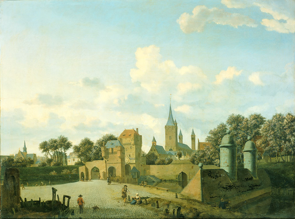 Van Jan van der Heyden, schilder en uitvinder, zijn zowel herkenbare als gefantaseerde stadsgezichten bekend. Bij de aankoop in 1834 omschreef Adriaan van der Hoop dit schilderij als een gezicht op de ‘Poort te Amersfoort’, nadat het eerder als de Leidse Poort te Amsterdam was herkend. De dubbele stadspoort lijkt echter nog het meest op de Waterpoort te Emmerik en de afgebeelde kerk is de Sankt Severin te Keulen. De driehoekige dam met de twee torentjes bevond zich in de verdedigingsgracht buiten de Amsterdamse Sint Anthonispoort. De afgebeelde figuren zijn van hand van Adriaen van de Velde, met wie Van der Heyden regelmatig samenwerkte.
