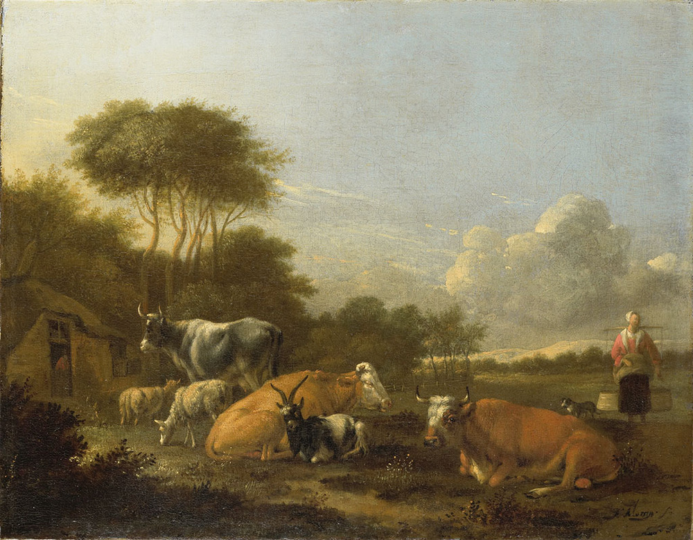 Landschap met vee. Op de voorgrond liggen koeien, een geit en enkele schapen. Rechts een boerin met een juk met emmers op de schouders, links een boerderij onder bomen