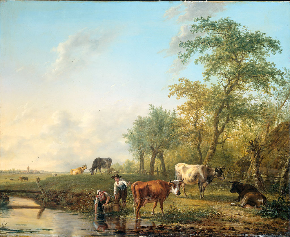 Landschap met vee. Op de voorgrond vullen een man en vrouw emmers in een sloot. Rechts een boerenschuur met een rieten dak onder bomen. Hiervoor drie koeien