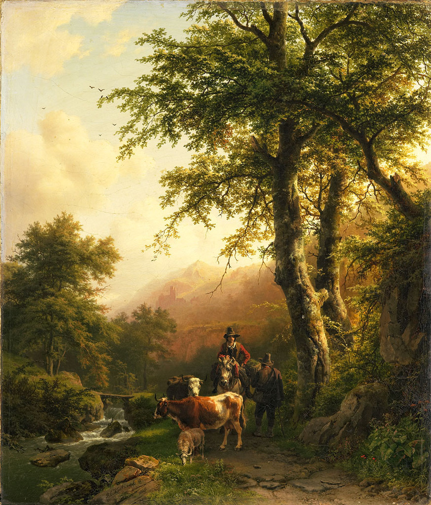 Italiaans landschap. Op een bergpad onder enkele bomen maken een herder en een man te paard een praatje met elkaar. Links een bergstroom, in de verte bergpieken en een kasteel