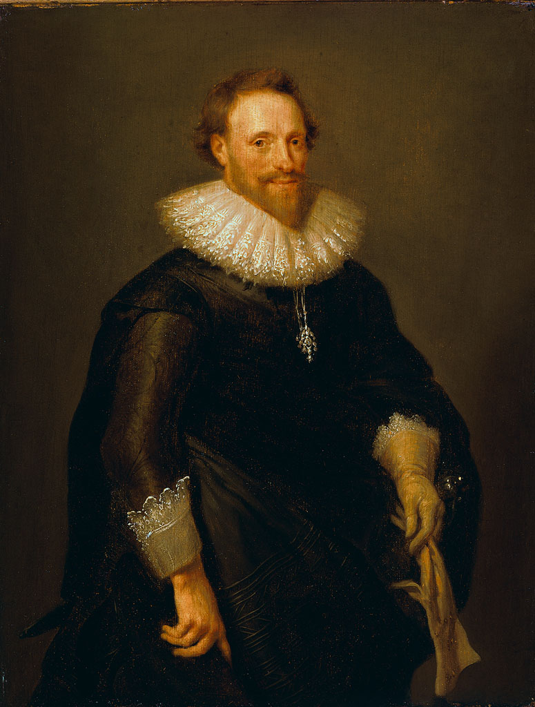 Pieter Cornelisz. Hooft, in driekwart, naar de rechterzijde gewend, in het bruin en zwart gekleed, om de hals een brede kanten kraag, aan de linkerhand een grijze handschoen en manchetten om de handen.