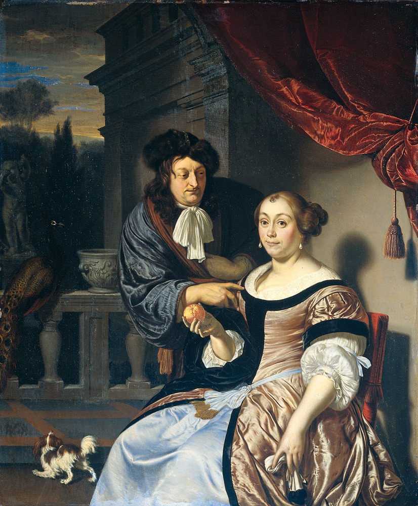 Een heer en een dame. Op een terras buigt een man zich over een vrouw die op een stoel zit. De vrouw houdt een sinaasappel in de rechterhand, links blaft een hondje naar een pauw op de balustrade