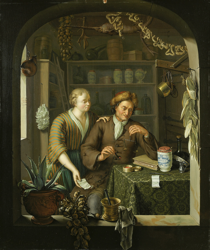 In zijn jonge jaren schilderde Frans van Mieris II, kleinzoon van Frans van Mieris I, een serie doorkijkjes naar interieurs, waarin zich ambachtelijke taferelen afspelen. In twee van zijn schilderijen zijn een apotheek en een kruidenierswinkel afgebeeld. Ondanks de grote overeenkomsten kunnen de werken niet worden beschouwd als tegenhangers.