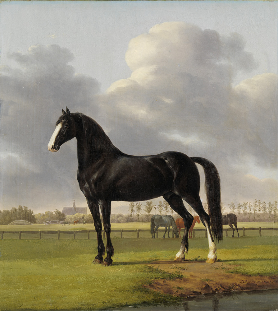 Het renpaard of de harddraver 'de Vlugge' van Adriaan van der Hoop in de weide. Op de achtergrond andere paarden en in de verte een kerk