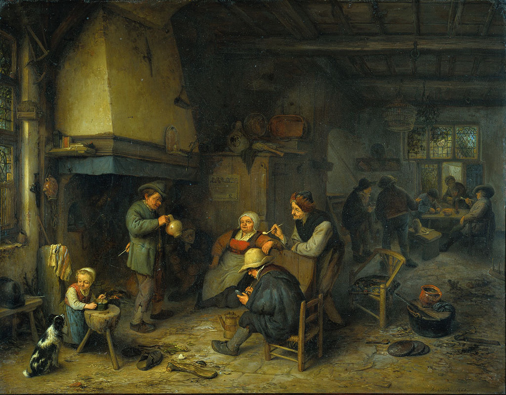 Boerengezelschap binnenshuis. Herberginterieur met op de voorgrond een gezelschap verzameld rond de haard. De mannen drinken en roken, links een meisje met een hond. Tegen de houten kast is een prent geplakt. Op de achtergrond zittende en staande boeren bij een tafel