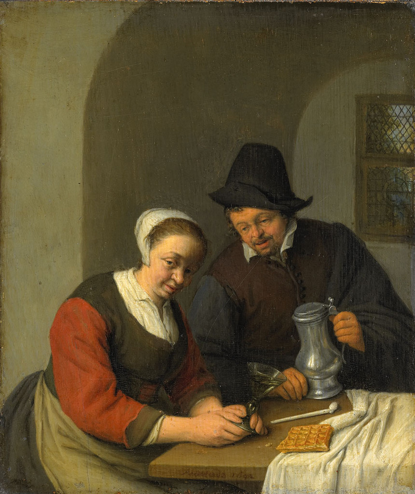 Het vertrouwelijk onderhoud. Een boer en boerin zittend aan een tafel in een herberg. Zij heeft een glas in de hand, hij een tinnen kan. Op tafel liggen een pijp en een wafel