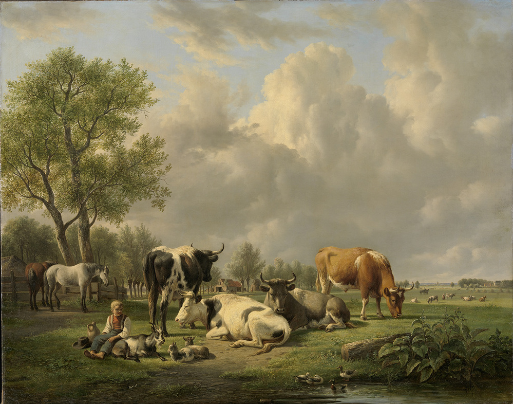 Weide met vee. Weiland met grazende en rustende koeien en een jongen bij een geit en jonkies, links staan twee paarden onder bomen. In de verte meer weilanden met vee. Op de voorgrond eenden bij de waterkant