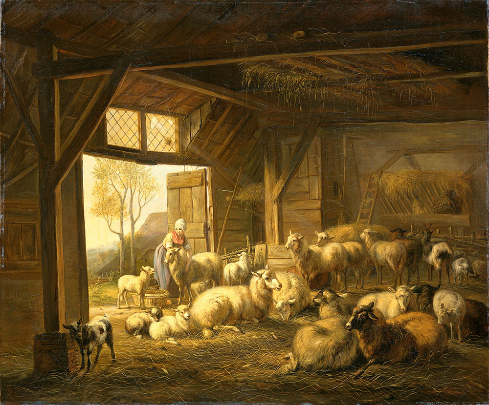 Stal met schapen en enkele geiten. Bij de ingang van de schuur staat een boerin