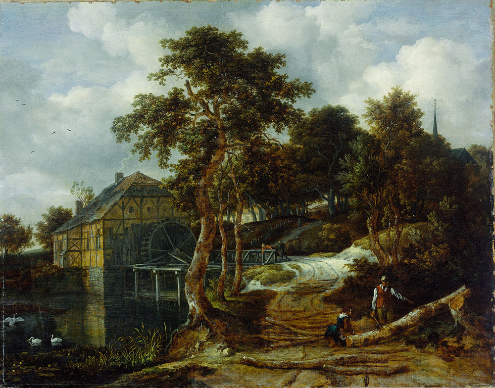 Landschap met watermolen gelegen aan een weg tussen bomen. Links een meertje met zwanen, rechts een houthakker