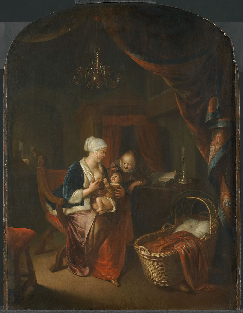 Interieur met een moeder die haar kind de borst geeft. Een oudere dochter kijkt toe, rechts staat de wieg
