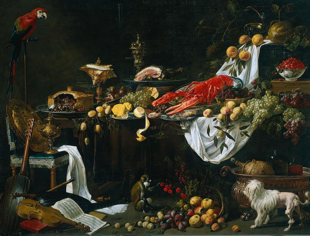 Stilleven. Een grote tafel met een pastei, schalen met fruit (druiven, citroenen, perziken, pruimen, vijgen en bramen). In het midden een kreeft en enkele krabben, een bord met een ham en een sierbokaal, een tazza, enkele glazen en een grote schelp op een voetstuk. Rechtsachter een bakje met aardbeien, een kalebas en wijnranken met een roemer. Op de voorgrond staat een hondje bij een wijnkoeler en een aap bij een omgevallen mand met fruit. Links een stoel met muziekinstrumenten (cello, viool, luit, fluit) en een liedboek en een papegaai op een stok.