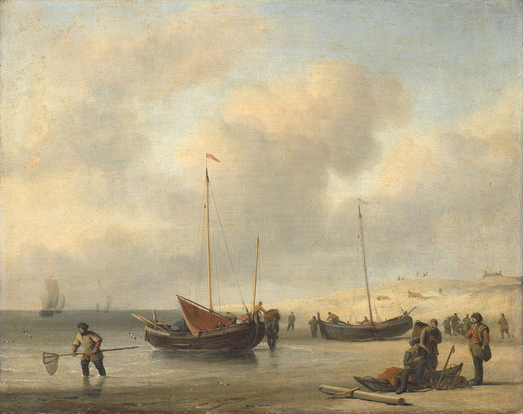 Vissersschepen aan het strand. Kustlandschap met enkele vissersschepen op het strand. Rechts vooraan een groepje vissers bij een anker en een roeibootje, links een man met een schepnet. Rechts de duinen van de kust