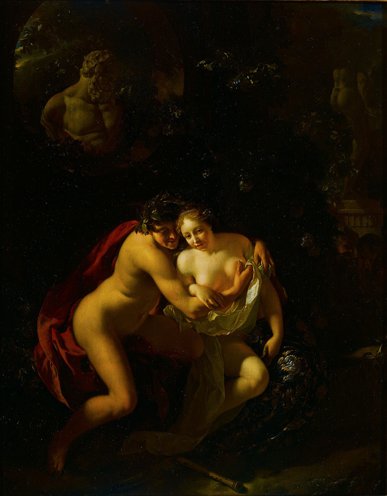 Liefkozend paar in een park door kinderen bespied. Een naakte jonge man met een lauwerkrans op het hoofd omhelst een naakte jonge vrouw. Op de grond ligt een fluit. Op de achtergrond beelden van Silenus en een dansende sater, rechts kijken twee kinderen vanachter struiken toe