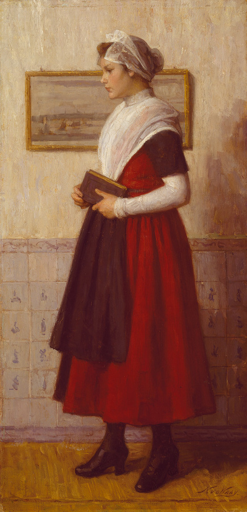 In het Amsterdamse Burgerweeshuis konden kinderen van Amsterdamse poorters (burgers met rechten om in de stad te wonen) terecht, die geen ouders of een moeilijke thuissituatie hadden. Kunstschilder Nicolaas van der Waay (1855-1936) had de Burgerweesmeisjes vaker door de stad zien lopen en een grote fascinatie opgevat voor de meisjes in de traditionele rood-zwarte uniformen. Van de regenten van het Burgerweeshuis kreeg hij echter geen toestemming om in het gebouw te schilderen. Wel kreeg hij van hen een meisjeskostuum geschonken, dat hem in staat stelde in zijn atelier en op verschillende locaties in de stad situaties met modellen in scène te zetten. Zijn schilderijen en tekeningen zijn daarom meer op te vatten als voorstellingen uit zijn fantasie, dan weergaves van hoe het leven in het weeshuis er daadwerkelijk aan toeging. ( Sarah Remmerts de Vries)