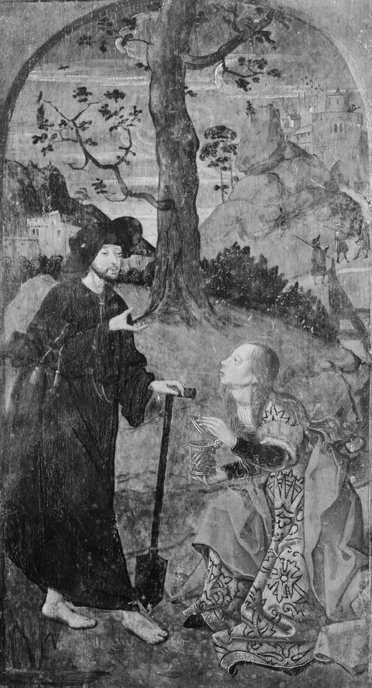 Links Christus, in donker gewaad met grote hoed, rechts Maria Magdalena geknield, in goudbrokaat en rode mantel. Zij heeft een beker in de hand, waarvan zij het deksel oplicht. Landschap met burchten en figuren op de achtergrond.