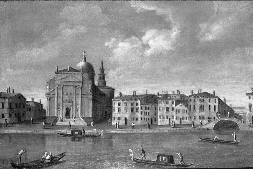 Gezicht op een kerk aan een kade in Venetië. Rechts enige huizen en een oude stenen boogbrug. Op de kade mensenfiguurtjes, evenals op de vier gondels in het water op de voorgrond.