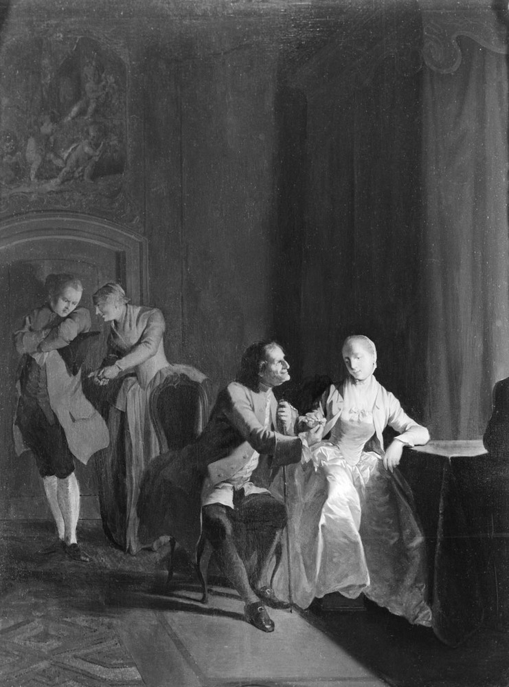 De duiding van de in de 18e eeuw geliefde 'conversatiestukken' is niet altijd eenvoudig. Midden in het vertrek zit een jonge vrouw aan tafel en neemt een ring aan van een oudere man, op de achtergrond een man en een vrouw, die een gebaar maakt alsof zij geld telt. Waarschijnlijk is hier een scène uit een toneelstuk afgebeeld.
