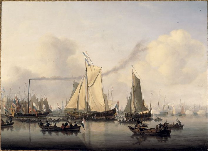 Op dit schilderij van Nicolaas Baur uit ca. 1816 is de feestelijke ontvangst van de eerste stoomraderboot in de haven van Amsterdam (24 september 1816) te zien. Koning Willem I kwam er speciaal voor naar de hoofdstad. Amsterdam had echter geen belangstelling voor een lijndienst met dit nieuwe Engelse vaartuig. ( Annemarie den Dekker)