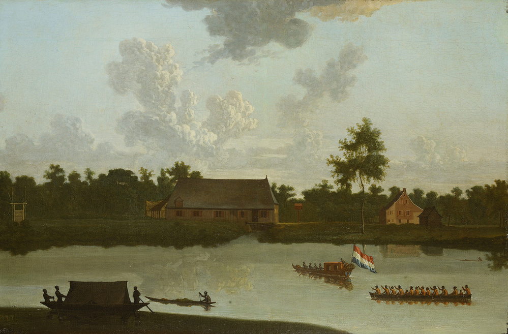 In 1706 tekent Dirk Valkenburg een bijzonder contract met Jonas Witsen (1667-1715). Hij verplicht zich om naar Suriname te gaan om daar vier jaar als boekhouder voor Witsen te werken en als schilder, waarbij hij rond mag reizen ‘om soo de plantagien alle drie naer ’t leven als andere raare vogels en gewassen te kunnen uytschilderen’. Recent onderzoek heeft aangetoond dat hier Witsens plantage Waterlant is geschilderd, die aan de linkeroever van de Surinamerivier lag. Valkenburg heeft de plantage vanaf de overkant van de rivier geschetst, op basis waarvan hij dit schilderij heeft gemaakt. Het grote gebouw in het midden is de suikermolen en het kookhuis, waar de suiker werd gekookt. Achter dit gebouw staan het destilleerhuis en het verblijf van de slaafgemaakte arbeiders. Het huis rechts, het enige gebouw van steen, is het woonhuis van de plantagedirecteur. Geheel links is nog een sluisje te zien.
