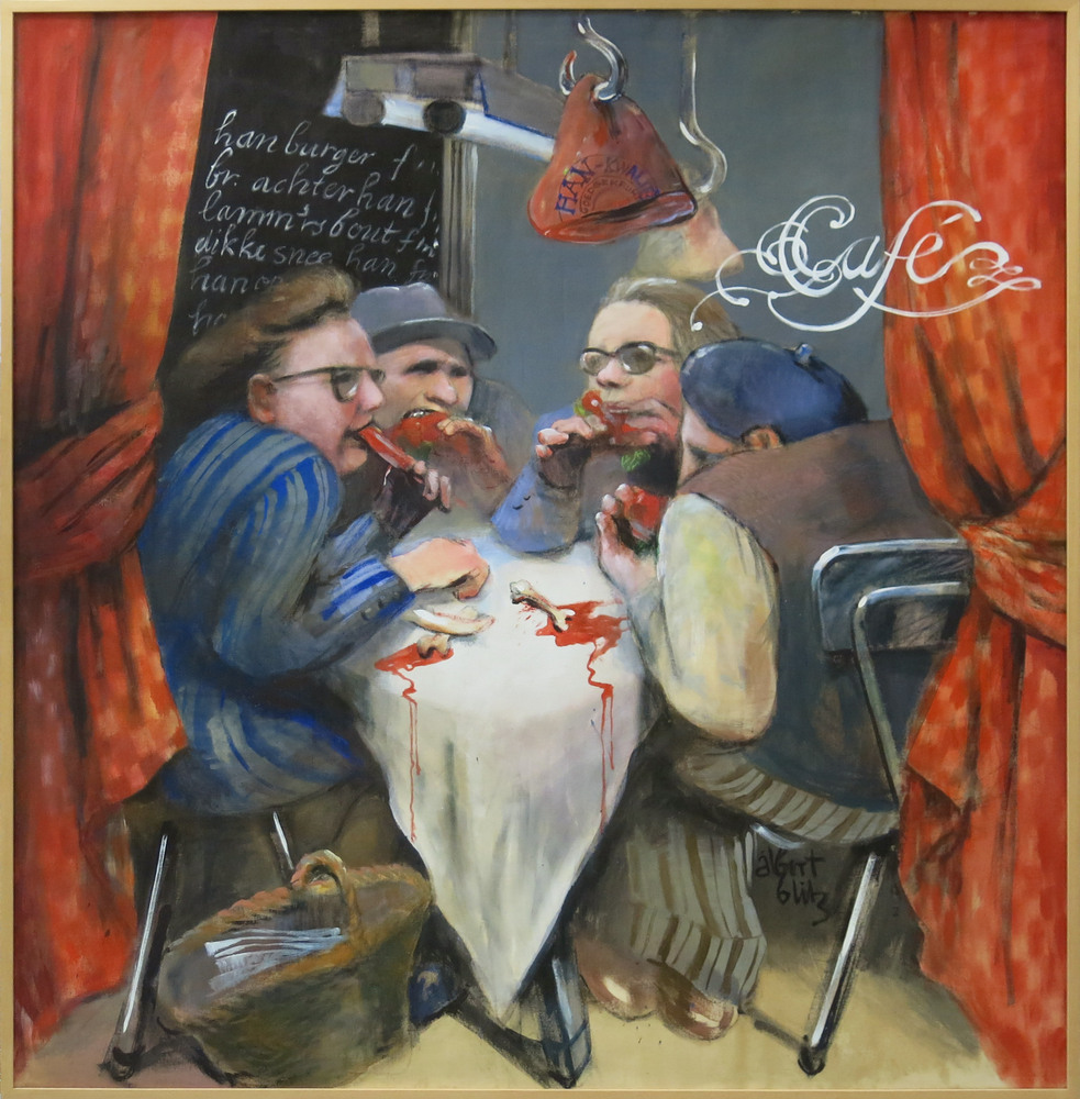 Dit lugubere caféinterieur met vier figuren die rond een tafel een bloederige snack nuttigen, is gelukkig geen weergave van een waargebeurde situatie. Het is een symbolische voorstelling van de sfeer die ten tijde van de metroaanleg in de Amsterdamse Nieuwmarktbuurt hing. Nieuwmarktbewoners waren destijds fel gekant tegen de toenmalige wethouder Han Lammers, die sloop van een deel van de Nieuwmarktbuurt ten behoeve van de metroaanleg voorstond. De bewoners konden hem wel ‘opvreten’, zoals ze hier letterlijk doen. Aan het plafond van Café ’t Hoekje hangt een ham waar ‘HAN’ opgeschreven staat. Het menu aan de muur maakt duidelijk dat er hier alleen maar producten van Han-vlees te bestellen zijn. ( Sarah Remmerts de Vries)