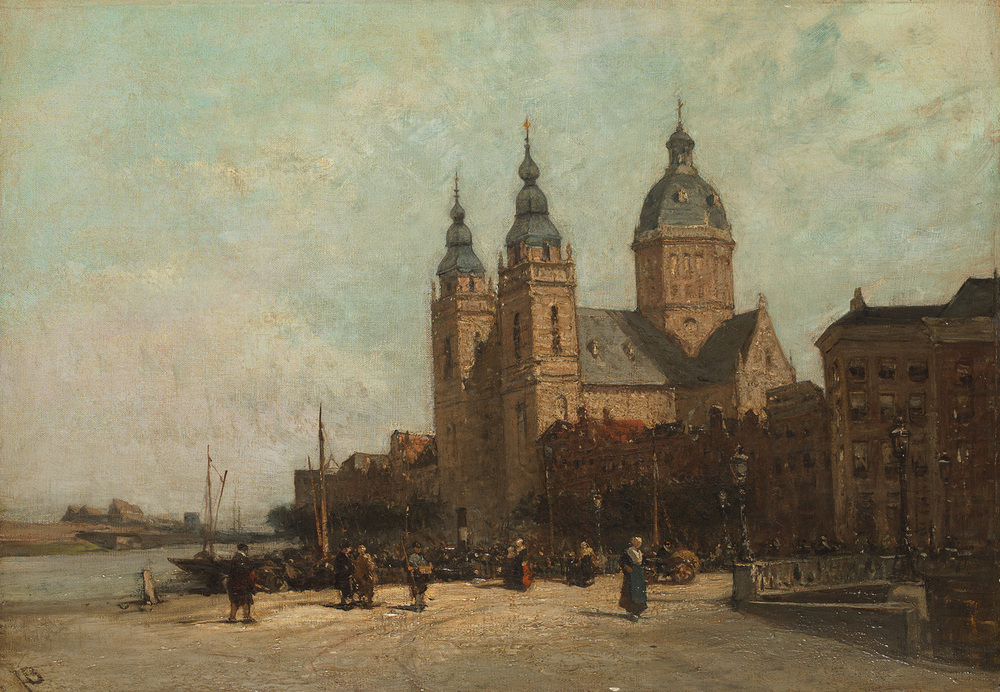 Dit gezicht op de Sint Nicolaaskerk is gemaakt na de oplevering van de kerk in januari 1887. Opvallend is de lichte kleur en het kort tevoren voltooide kerkgebouw. waarschijnlijk heeft Johannes Bosboom, wiens monogram linksonder is te lezen, een eerder werk van Carel Behr voltooid.