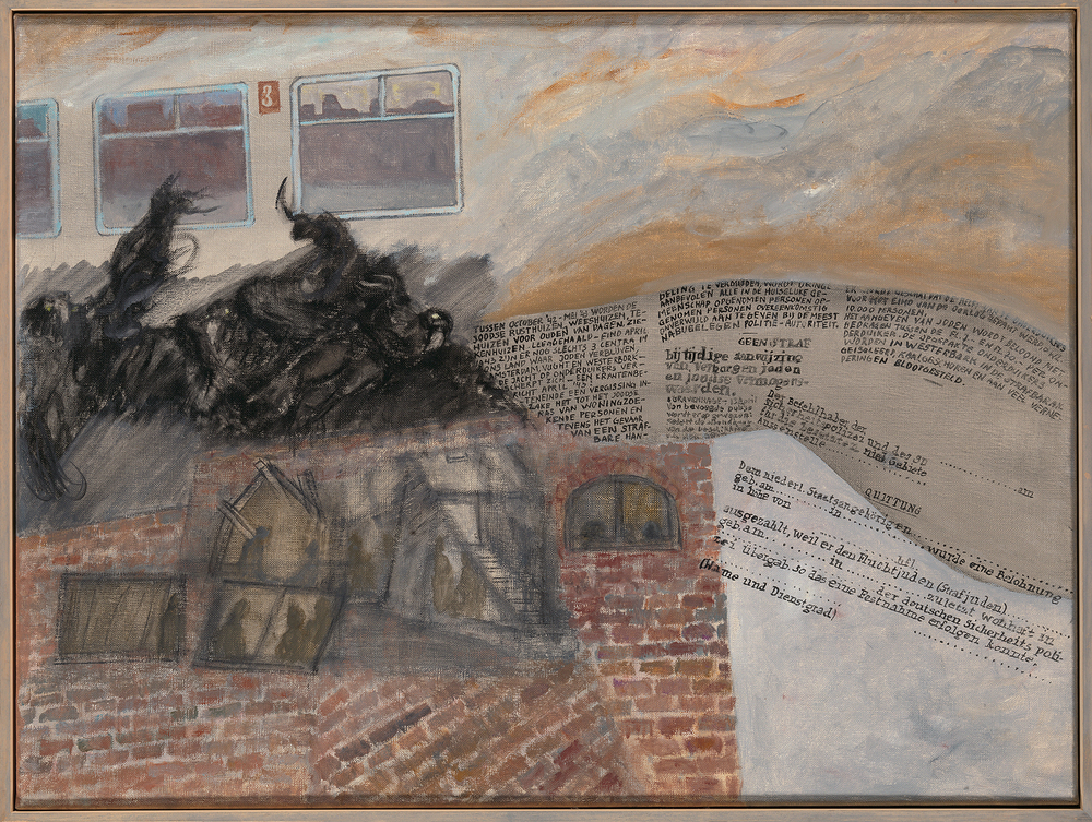 Clara de Jong schildert hier in zestien delen het vreselijke lot van de joodse bevolking van Amsterdam tijdens de Tweede Wereldoorlog (1940-1945). Het eerste schilderij start in de stad, met de antisemitische maatregelen die door de bezetter genomen worden. Vervolgens wordt de toeschouwer chronologisch meegenomen langs razzia’s, segregatie, de Hollandsche Schouwburg en de deportatie naar concentratiekampen. Elk schilderij bevat een of meerdere zwarte raafachtige figuren, die als brengers van onheil over de voorstelling waken. Op het laatste paneel is slechts een lange lijst namen van gedeporteerden weergegeven, oplossend in een zwarte wolk. ( Sarah Remmerts de Vries)