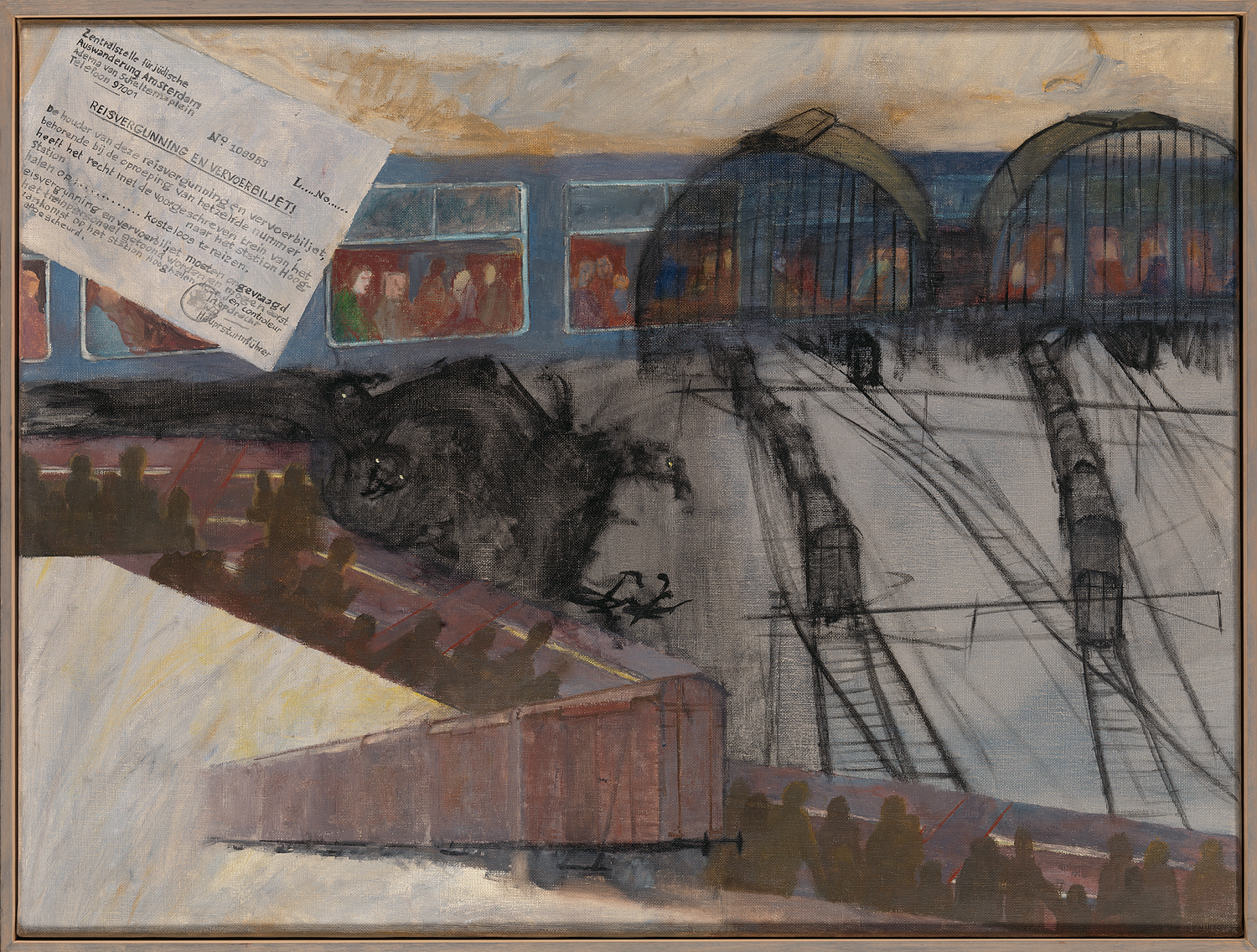 Clara de Jong schildert hier in zestien delen het vreselijke lot van de joodse bevolking van Amsterdam tijdens de Tweede Wereldoorlog (1940-1945). Het eerste schilderij start in de stad, met de antisemitische maatregelen die door de bezetter genomen worden. Vervolgens wordt de toeschouwer chronologisch meegenomen langs razzia’s, segregatie, de Hollandsche Schouwburg en de deportatie naar concentratiekampen. Elk schilderij bevat een of meerdere zwarte raafachtige figuren, die als brengers van onheil over de voorstelling waken. Op het laatste paneel is slechts een lange lijst namen van gedeporteerden weergegeven, oplossend in een zwarte wolk. ( Sarah Remmerts de Vries)
