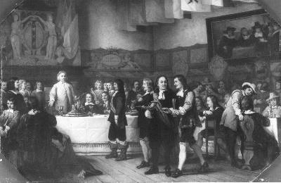 Het Sint-Lucasfeest in de St. Jorisdoelen waarbij Joost van den Vondel de Lauwerkrans ontvangt, 20 oktober 1653, 1866 doek hoogte doek: 86.3 cm; breedte doek: 129.5 cm; hoogte lijst: 124.5 cm; breedte lijst: 163 cm; opschrift l.o.: H.A. van Trigt f 1866