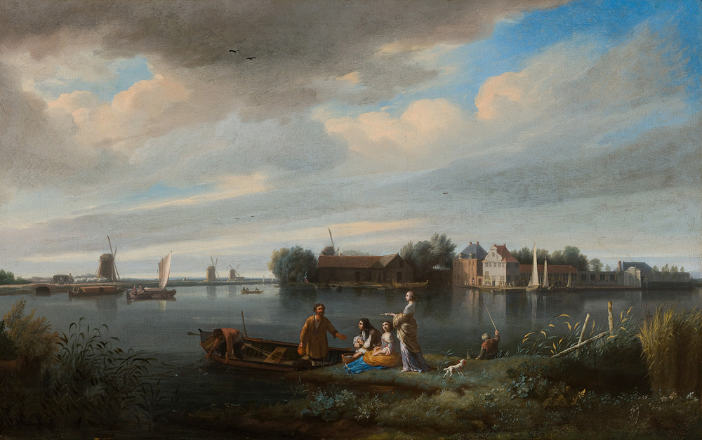 Vanaf een standpunt aan de westelijke oever van de Amstel, even buiten Amsterdam, heeft de schilder zijn blik gericht naar het zuidoosten. Aan de overkant is rechts de bebouwing te zien op de Omval, een landtong tussen de rivier en de Diemermeer. Op de voorgrond zijn drie goedgeklede jongelieden in gesprek met een visser. Onderhandelen zij over de prijs van vis of willen ze worden overgezet naar de populaire ‘plaisierplaats’ aan de overkant? Bij het witte huis, toentertijd in bezit van de gebroeders Jacobus en Michiel Wiltschut, liggen enkele zeilbootjes afgemeerd, terwijl de passagiers zich verpozen rond het gebouw. Ernaast bevindt zich de scheepswerf van Marten Willemsz.
