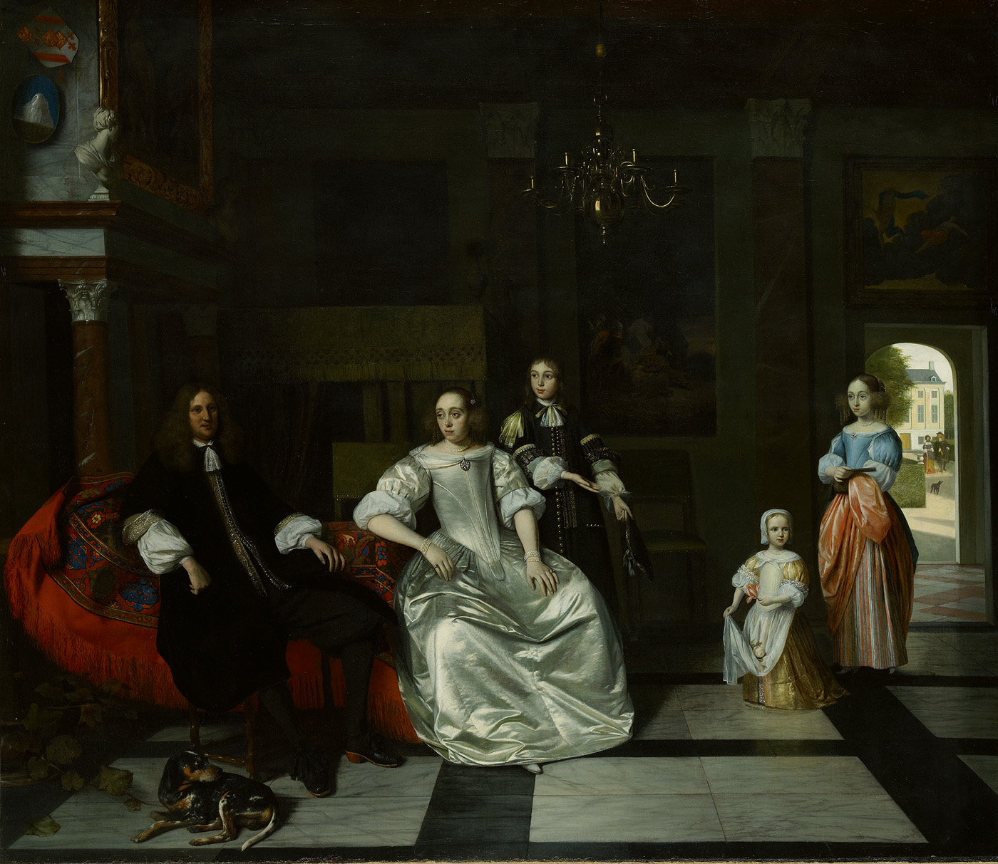 De hele familie is keurig uitgedost. Staande achter zijn moeder wijst zoon Balthasar op zijn twee zusjes, die juist zijn binnengekomen. Het vertrek ademt de grandeur die niet in de Warmoesstraat moet worden gezocht; waarschijnlijk betreft het een fantasie-interieur. Tegen de schouw zijn de familiewapens aangebracht. Klassieke sculpturen en schilderijen met verheven thema’s benadrukken de gewenste status van de familie. Pieter de Hooch is bekend vanwege zijn huiselijke taferelen waarin kleine of grotere gezelschappen zich verpozen in een kamer of op een plaatsje achter een Hollands huis. In 1660 of 1661 verhuisde De Hooch van Delft naar Amsterdam. In 1684 overleed hij aldaar in het Dolhuis. ( Norbert Middelkoop)