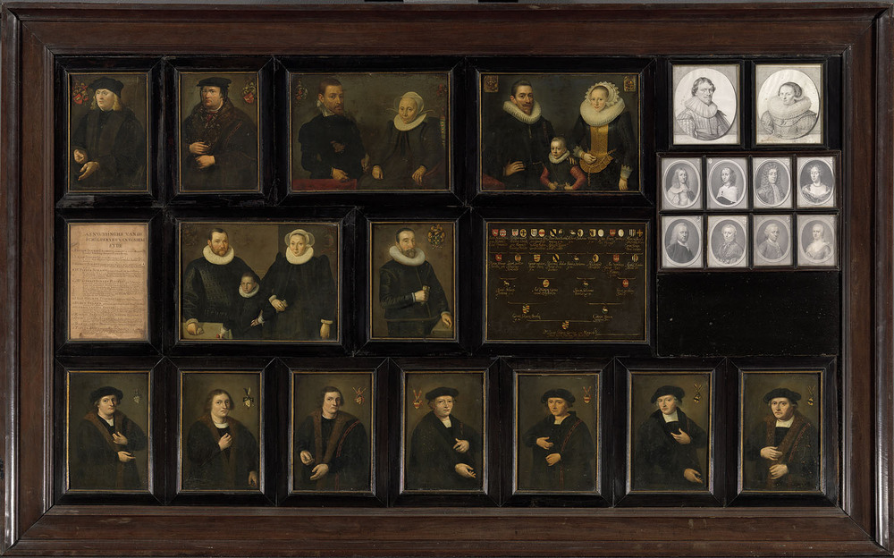 Op deze verzameling schilderijtjes en tekeningen heeft de jurist Mr. Gerrit Schaep (1599-1655), tevens amateurgenealoog, zijn voorouders van vaderszijde laten verbeelden door verschillende kunstenaars en kopiïsten. Hoe hij hiertoe was gekomen, geeft hij zelf aan: 'dat men tot Dordrecht vrij wat staty off werck maeckte sijn voorouders schilderien ende geslachtboom ten toon te hangen ende dat ick derhalven, als daer nu wonende, ooc wel wilde toonen van wat voorouders ic van 's vaders zijde mede gesproten was. Gerrits moeder kwam uit Dordrecht. Zelf trouwde hij daar in 1623 en bekleedde er tot zijn vertrek naar Amsterdam, in mei 1629, enkele functies, waaronder die van schepen. Het Dordtse patriciaat had van oudsher aristocratische allures, en waarschijnlijk was Schaeps gevoeligheid voor zijn afkomst hier mede door gevoed. Amsterdam kende nog niet zo'n traditie, maar met de aristocratisering van het Amsterdamse patriciaat gedurende de zeventiende eeuw kreeg men ook daar meer oog voor stambomen. Dit werk laat deze interesse op een, voor de zeventiende eeuw, unieke wijze zien. Waarschijnlijk heeft Schaep dit verzamelportret ook ter nagedachtenis voor zijn kinderen laten maken. Op de kwartierstaat staat het resultaat van Schaeps onderzoekingen. Tot en met zijn betovergrootouders, de 16 kwartieren, heeft Schaep de namen en wapens laten weergeven. Gelukkkig was hij ook zo behulpzaam om 'Aenwysinghe' op het paneel aan te brengen: een genummerd lijstje met de namen van de geportretteerden. Behalve de acht tekeningen rechts in het midden, die blijkbaar later zijn aangebracht, is ook ieder portret genummerd. Hierdoor weten we dat de twee tekeningen rechtsboven (nrs. 6 en 7) van de hand van David Bailly, Gerrit Schaep en zijn vrouw Johanna de Visscher voorstellen. Op de bovenste rij zijn, van rechts naar links, Schaeps voorouders afgebeeld: eerst zijn vader dr. Pieter Gerritsz Schaep (nr. 4) en moeder Margriete Pauli Halling (nr. 5), met tussen hen in Gerrit zelf op jonge leeftijd. Dan volgen zijn grootouders, Gerrit Jacobsz Schaep en Catryn Symon Baucke Sakemadr (nr. 3). Met zijn overgrootvader Jacob Pietersz Schaep (nr. 2) en over-overgrootvader Pieter Jacobsz Schaep (nr. 1) is de afstamming van vaders kant voor meer dan een eeuw weergegeven.