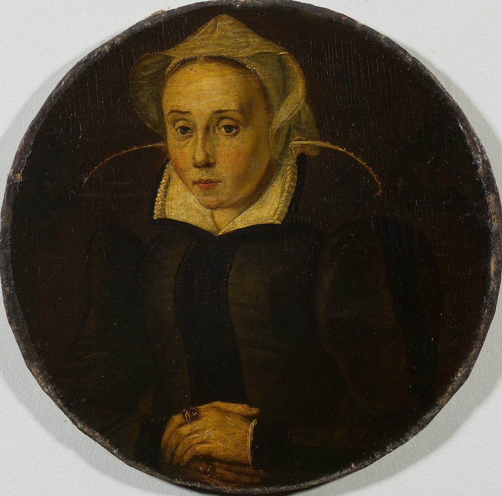 Tegenhanger van het voorgaande nr. Opschrift “Aet 26”. Rechts boven, op dezelfde plaats waar zich op de tegenhanger het familiewapen bevindt, is kennelijk een wapen weggekrabd. Lysbeth van Leuven (1543 1625), dochter van Hans Jansz. van Leuven en Annetje Roelofsdr. Karstens, huwde in 1564 met Willem Backer. Zij kregen drie kinderen (zie: ELIAS I, blz. 238). Het opschrift "Aet 26" duidt erop dat het portret uit (ca.) 1569 stamt. ( Albert Blankert)