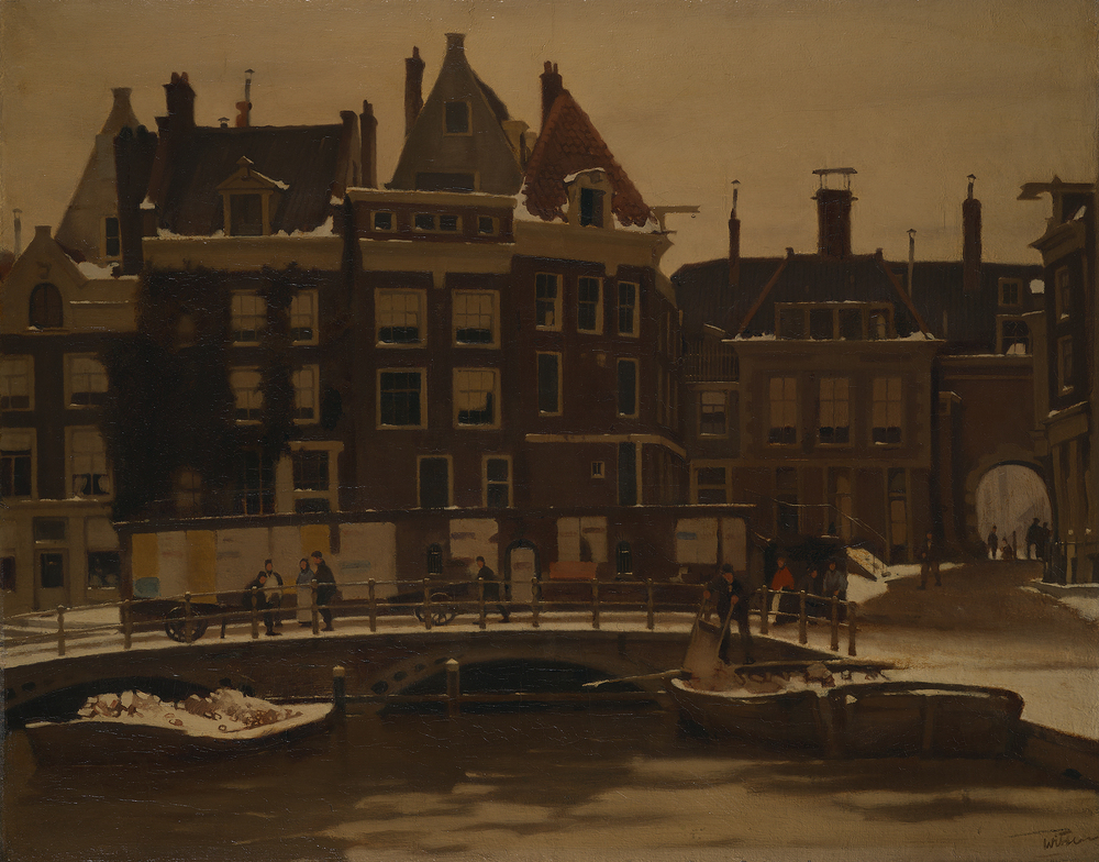 De graficus en schilder Willem Witsen was jarenlang met Breitner bevriend. Zijn gegoede afkomst stelde hem in staat om kunstbroeders te ondersteunen. Witsens huis aan het Oosterpark fungeerde jarenlang als ontmoetingsplaats van vernieuwingsgezinde kunstenaars. Zowel Breitner als Israels hebben er hun atelier gehad. Vanaf de late jaren ’80 zocht Witsen zijn onderwerpen steeds meer in de stad. Zowel in zijn etsen als in zijn schilderijen benadrukte hij de verstilde schoonheid van oud-Amsterdam. Anders dan bij Breitner was voor hem de menselijke aanwezigheid van ondergeschikt belang. Vanaf 1911 maakte Witsen gebruik van een drijvend atelier. Het uitzicht op het Oude Beurspleintje is gezien vanaf het nog ongedempte Rokin. Het werd door Witsen vastgelegd in dit schilderij en in een ets uit 1912. De sloop in dat jaar van de huizenrij tussen het Rokin en de Dam vormde mogelijk de aanleiding tot deze winterse impressie.