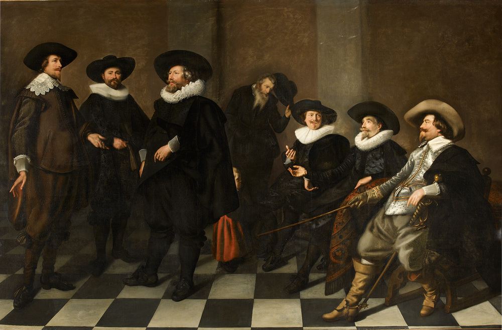 Op het schilderij van de regenten door Abraham de Vries zijn van links naar rechts geportretteerd: Gerrit Pietersz Schaep (1599-1655) Gerbrant Claesz Pancras (1591-1649, Nicolaes van Campen (1586-1638), Frans de Neve (1594-1644), Cornelis Jacobsz Wayer (1583-1654) en Nicolaes Hasselaer (1593-1635). De laatste vier komen eveneens voor op een zilveren tazza uit 1635, door de zittende regenten geschonken aan hun meestertimmerman, in dank voor de bewezen diensten. De in het zilver gegraveerde figuren zijn overgenomen van het schilderij en voorzien van namen, waarmee hun identiteit vaststaat. Van de twee meest linkse regenten bezit het AHM andere, vergelijkbare portretten.