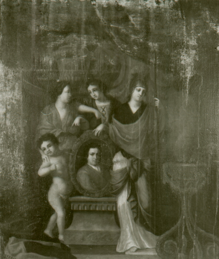 Drie vrouwen en een putto staan rond een in een ovale lijst gevat mansportret. De vrouw rechts is Minerva, de middelste heeft de drie Andreaskruisen van Amsterdam op de borst en een beurs in de hand (de Stedemaagd). De linker draagt een zweep. Uit de (offer?)schaal op rijkbewerkte voet rechts op de voorgrond stijgt rook op. Links een bijenkorf. De titel is ontleend aan een lijst van schilderijen in het Burgerweeshuis van ca. 1880. In het "Cas comptoir" van het Burgerweeshuis hing een schilderstukje: "door Jurriaan Pool geschilderd, en aan het Weeshuis vereerd; waarin hy zig zelven, in weezenkleedinge, heeft afgebeeld, ter gedagtenisse zyner opvoeding in dit Godshuys"(WAGENAAR II, blz. 278). Dit zelfportret is 1688 gedateerd en bevindt zich nu in het nieuwe gebouw van het Burgerweeshuis. De voorgestelde draagt geen "weezenkleedinge". Ons stuk is, zo merkte Krielaart op, het schilderij dat Wagenaar zag in de Linnenkamer: "Nog een stuk van Pool, waar hy, in een nachtrok, geschilderd" is. De voorgestelde draagt geen "Weezenkleedinge"; die ligt links op de grond.
