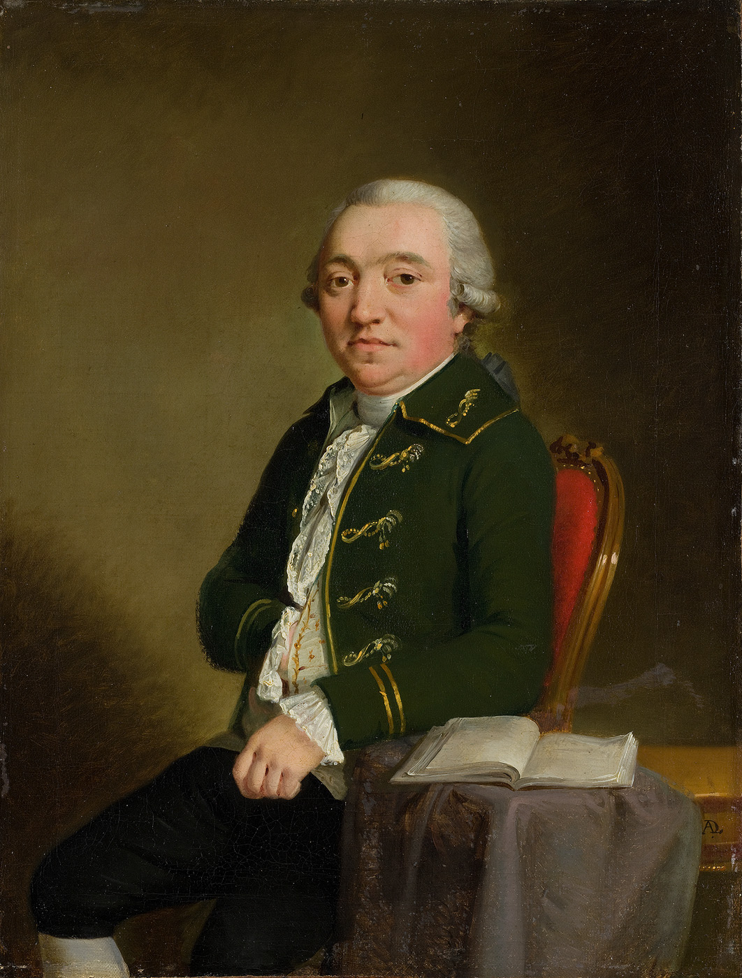 Tegen een vaal lichtgroene achtergrond een heer met grijs mozart-kapsel, zittend op een stoel met rode rugleuning, driekwart naar links, de ogen op de beschouwer gericht. Hij leunt met zijn linker onderarm op een smalle tafel met doek erover, waarop opgeslagen boek. Hij draagt een vaalgroen jasje met gouden tressen, een licht vest waaronder kantstroken en waartussen zijn rechterhand.