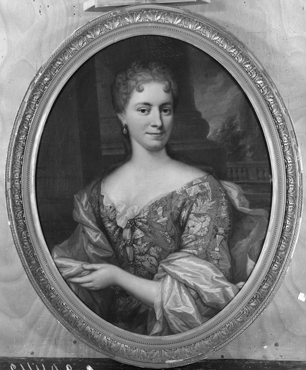 Jonge knappe vrouw tot heuphoogte, het lichaam iets naar links, hoofd naar voren, de ogen op de beschouwer gericht, glimlach om de mond. Zij draagt een sterk gedecolleteerde, goudbruine, zwaar geborduurde japon, met nauw lijfje, waarover rond de rug naar voren over de armen vallend een lichtgrijze losse stof, die zij met haar linkerhand van haar rechterarm opneemt. Smal om het hoofd liggend licht krullend, grijs gepoederd haar, dat, van achteren bijeen gehouden, langs de volle schouderlijn omlaag valt. Decorachtig fond met pilaar.