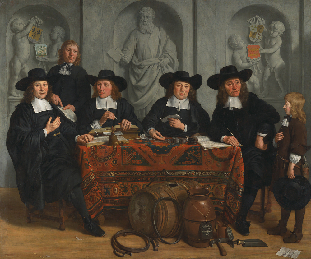 Dit groepsportret toont de vier overlieden van het Amsterdamse kuipers- en wijnverlatersgilde aan de vergadertafel. Een kuipersleerling kijkt toe. Van den Eeckhout kreeg de opdracht voor het schilderij mogelijk omdat zijn broer tot het gilde had behoord.