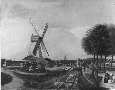 De Steur, gelegen ter hoogte van de huidige Tweede Nassaustraat. De molen, gebouwd in 1651 en afgebroken in 1891, was eigendom van Johan Georg Schreuder, die hier tussen 1844 en 1860 zijn bedrijf had. Zijn gezin is afgebeeld bij het woonhuis achter de molen. De tamelijk primitief geschilderde voorstelling is kennelijk bedoeld als een groepsportret van de molen en de gebouwen er omheen, van de bewoners en de werkkrachten. Op de achtergrond zijn nog twee houtzaagmolens afgebeeld, beide gelegen aan de Kostverlorenvaart: links ’t Blok, verbrand in 1858, en rechts De Schelvis, gesloopt in 1890.