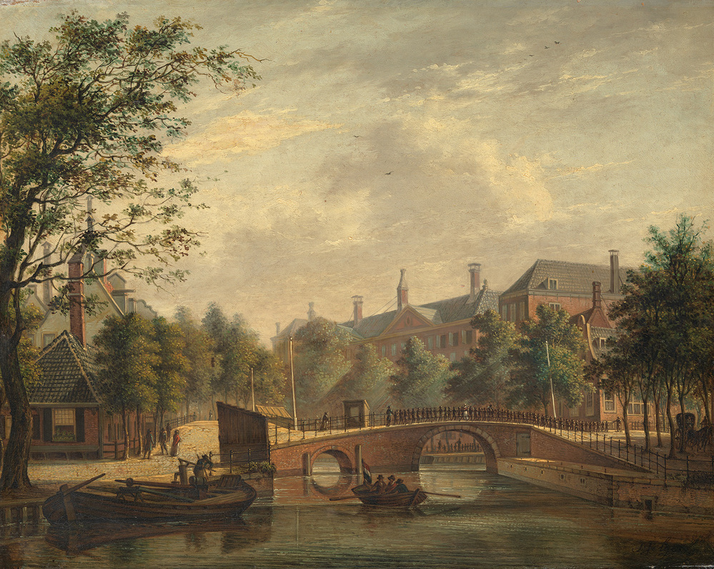 Het Aalmoezeniers-weeshuis, gezien vanaf de Prinsengracht over de verbindingsbrug van de Leidsegracht
