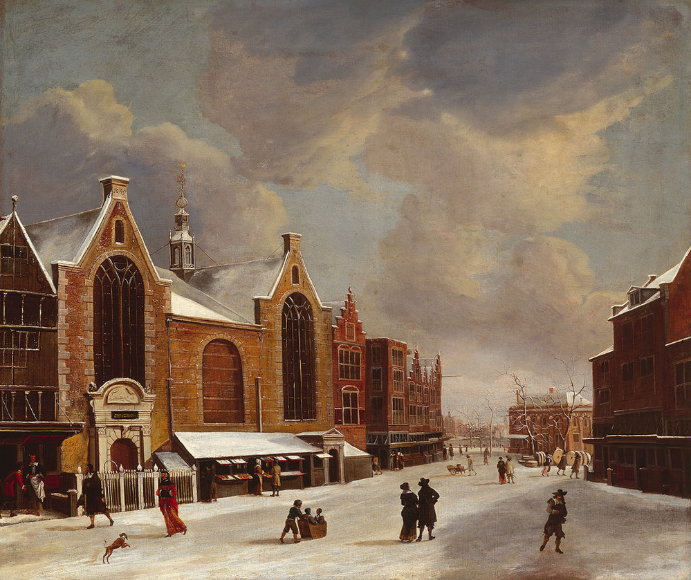 Deze winterse impressie is gemaakt na de verbouwing en vergroting van het gebouw in 1644-46. Op de achtergrond zijn de slijpstenenmarkt en schepen in het IJ te zien. ( Norbert Middelkoop)