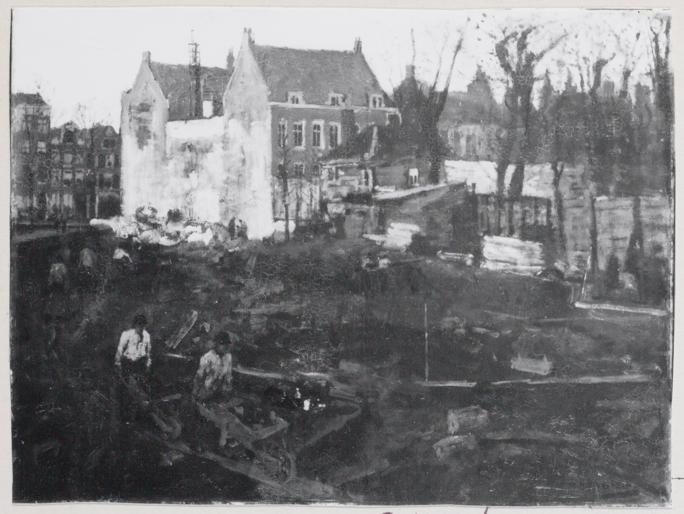 Breitner richtte, mede door de invloed van fotografie, zijn blik sterk naar beneden, waardoor de horizon op dit schilderij laag is komen te liggen. Een dergelijke manier van kijken komt zowel in Breitners schilderijen als in zijn foto's voor. De onderste helft is voornamelijk donker van kleur, met slechts een enkel kleurig accentje in de vorm van stokken en mannen met kruiwagens. Bouwputten waren een geliefd onderwerp van de kunstenaar.