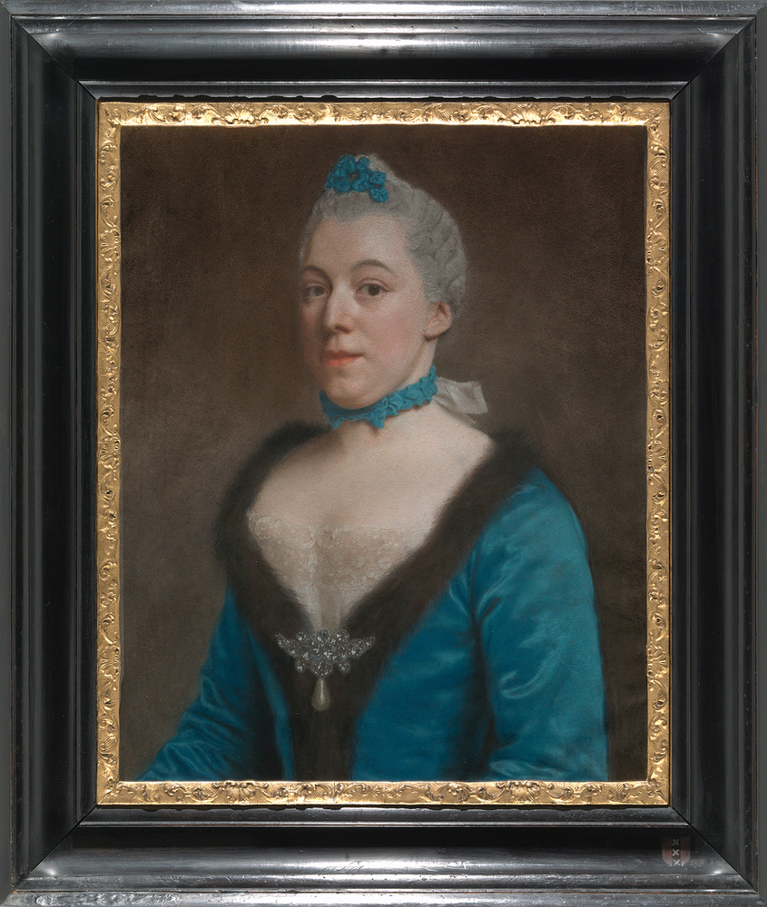 Clara's blauwe satijnen japon heeft een diep décolleté en is afgezet met zwart bont. Als eye-catcher draagt zij een kostbaar ogende, met diamanten ingelegde strikbroche, waaraan een grote parel hangt. Het gepoederde haar (een pruik?) is ingevlochten in de modieuze tête-de-mouton stijl, en de rosetjes hierin zijn gemaakt van dezelfde stof als het lint met ruches dat met een strik om haar nek is bevestigd.